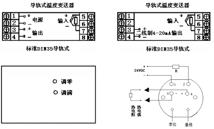 對導(dǎo)軌式溫度變送器輸入可以是熱電偶、熱電阻、標(biāo)準(zhǔn)信號。工作電源接端子1、2,4~20mA輸出信號接3正、4負;對二線制4~20mA輸入信號正接5、負接6;熱電阻單端A接5、并聯(lián)端B、C分別接6、7。
