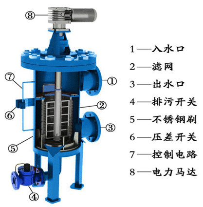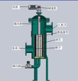 的排污閥;馬達(dá)帶動本體濾網(wǎng)內(nèi)的兩把不銹鋼刷轉(zhuǎn)動,被濾網(wǎng)所