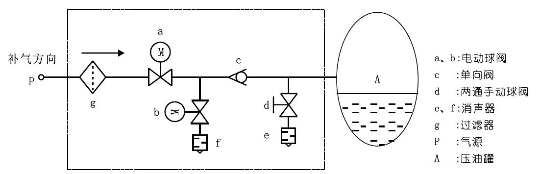 停止補(bǔ)氣:當(dāng)壓油灌A補(bǔ)滿時(shí),關(guān)閉電動(dòng)球閥a,停止補(bǔ)氣。打開電動(dòng)球閥b,壓油灌A的氣壓被單向閥c阻斷,a和c之間的管段被排空至常壓,單向閥密封增強(qiáng)。同時(shí),防止球閥a滲漏過(guò)補(bǔ)氣。